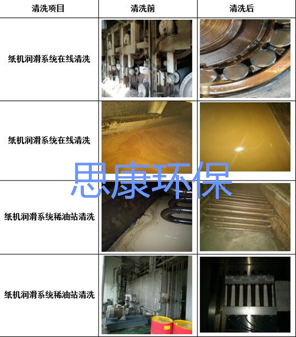 通過線清洗劑迅速滲透分散積垢,將油泥、積垢排到稀油站過濾清除,并得保持潤滑系統(tǒng)正常運轉(zhuǎn)。待紙機、管道清洗完后,將舊油排空到稀油站,并將稀油站的過濾系統(tǒng)和儲油槽清洗干凈。